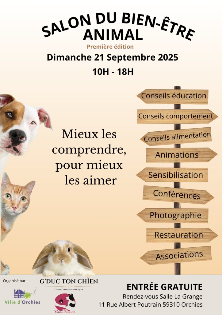 Dans le cadre de la 3e édition de la Semaine du Chien, la mairie d'Orchies et les associations canines Cani Respect et Gduc ton chien organisent une journée autour du bien-être animal le 21 septembre de 10h à 18h à la salle La Grange.